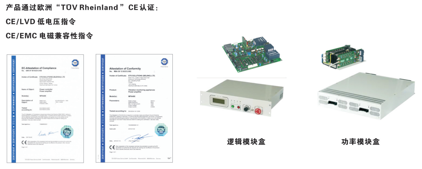 MPA系列功率放大器是采用正弦脈沖寬度調(diào)制技術(shù)的數(shù)字式功率放大器。其工作原理是:利用MOSFET場(chǎng)效應(yīng)管的高頻開關(guān)能力,將控制儀輸入的低電壓信號(hào)通過(guò)數(shù)字電路進(jìn)行放大并還原成原信號(hào),然后將其輸出至電動(dòng)振動(dòng)臺(tái)的動(dòng)圈線路,推動(dòng)電動(dòng)振動(dòng)臺(tái)臺(tái)面運(yùn)動(dòng)。數(shù)字式功率放大器的主要組成部分:邏輯模塊盒,功放模塊盒,保護(hù)電路,勵(lì)磁電源部分和電柜。 MPA功率放大器的輸出范圍為1kVA~1000kVA。系統(tǒng)技術(shù)指標(biāo)完全適用于現(xiàn)有的或新的風(fēng)冷或水冷型電動(dòng)振動(dòng)臺(tái)。可用于替換其他廠商同型號(hào)的功率放大器。 MPA 系列功率放大器是采用新技術(shù)設(shè)計(jì)的寬頻帶數(shù)字開關(guān)功率放大器,主要有邏輯模塊、功率模塊、勵(lì)磁電源模塊等組成。MPA 系列功率放大器功率器件均采用美國(guó)知名公司供貨,質(zhì)量有保證。 MPA系列功率放大器產(chǎn)品通過(guò)歐洲“TUV Rheinland”CE認(rèn)證.