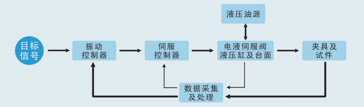 液壓振動試驗系統的主要工作原理是采用可控制的電液伺服閥,通過調節液壓油的壓力使作動裝置產生往復振動。輸入的電控信號經放大器進入伺服閥,伺服閥將與輸入信號成比例的液壓油輸入液壓缸,以驅動活塞并帶動臺面運動。液壓振動試驗系統能產生較大的推力和位移,并且在低頻的時候也可以提供較大的激振力。